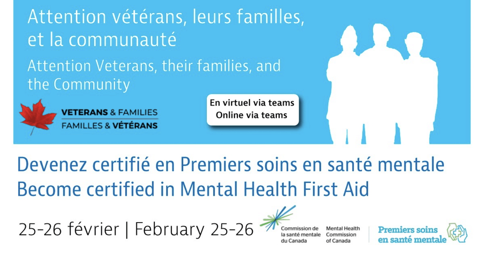 Vous êtes vétéran(e) ? Militaire ? Conjoint(e), ami(e) ou proche d’un vétéran ? Offrez-vous un outil essentiel : devenez certifié(e) en Premiers soins en santé mentale. Cette formation vous permettra de : Reconnaître les signes précoces d’un trouble de santé mentale Intervenir efficacement en situation de crise Soutenir les membres de la communauté vétéran 25-26 […] |